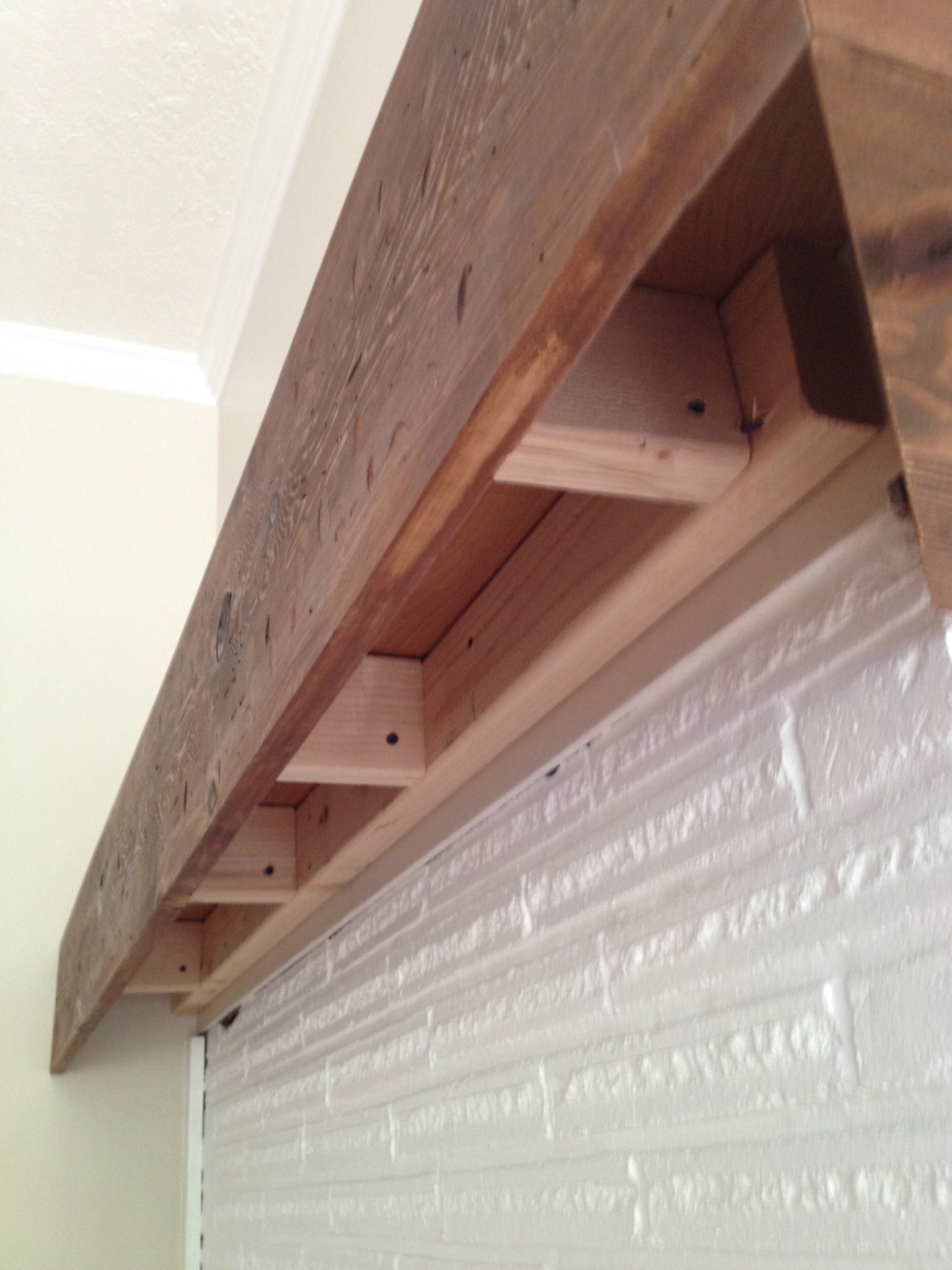 Assembling the mantel was a bit of a challenge. My dad and I decided it would be best to attach the boards one by one so we could ensure that everything was level. This worked very well for us, but I wish we could have assembled it all and then mounted it.
