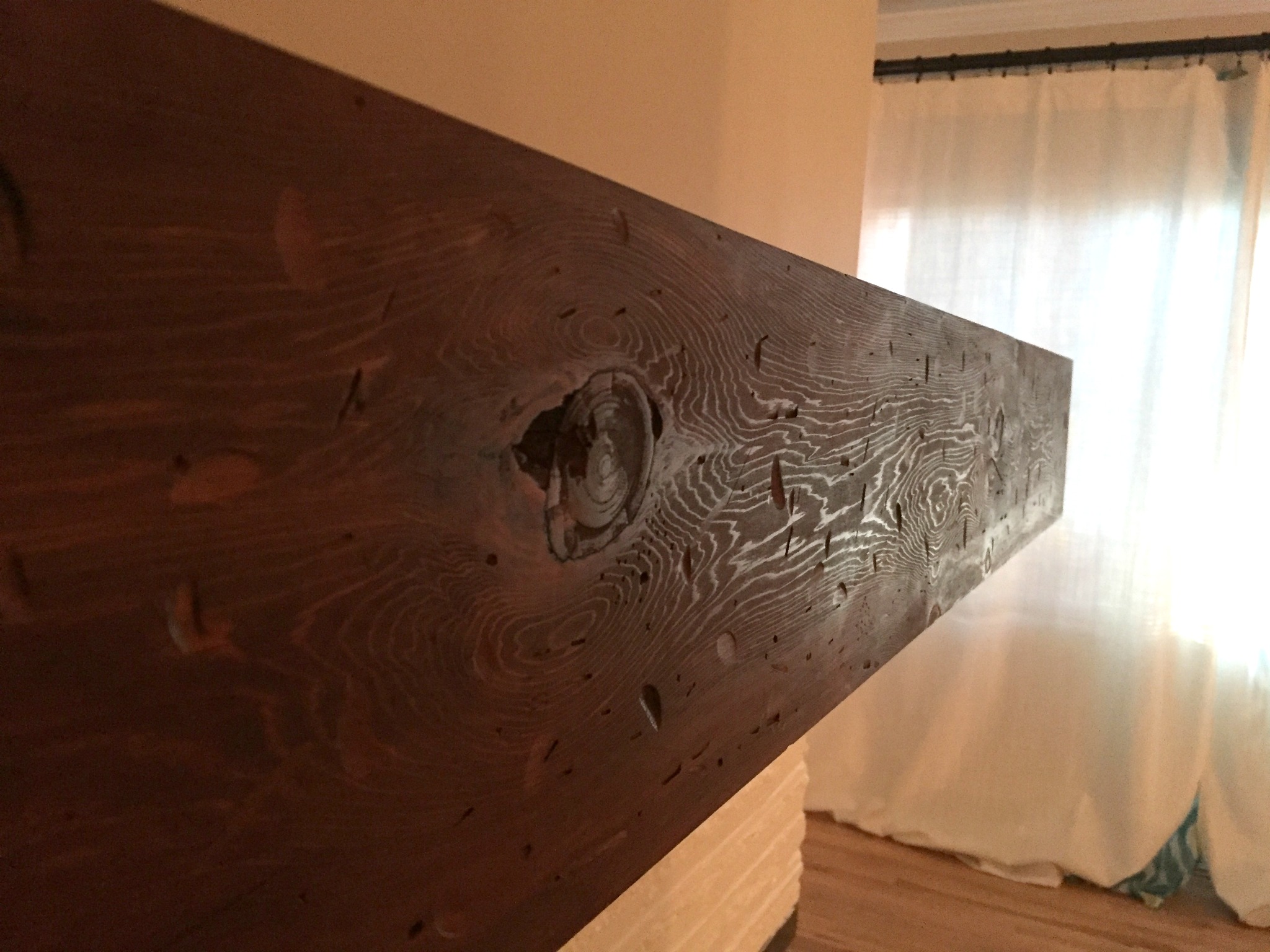 I chose it for a few reasons: cost and overall rustic look. When selecting the wood, pay very close attention to the overall straightness of it. If you want it to fit tight against the wall, then it needs to be straight! Here is an excellent article on how to pick good lumber. I wanted it to look like a barn beam with lots of knots and gnarls.