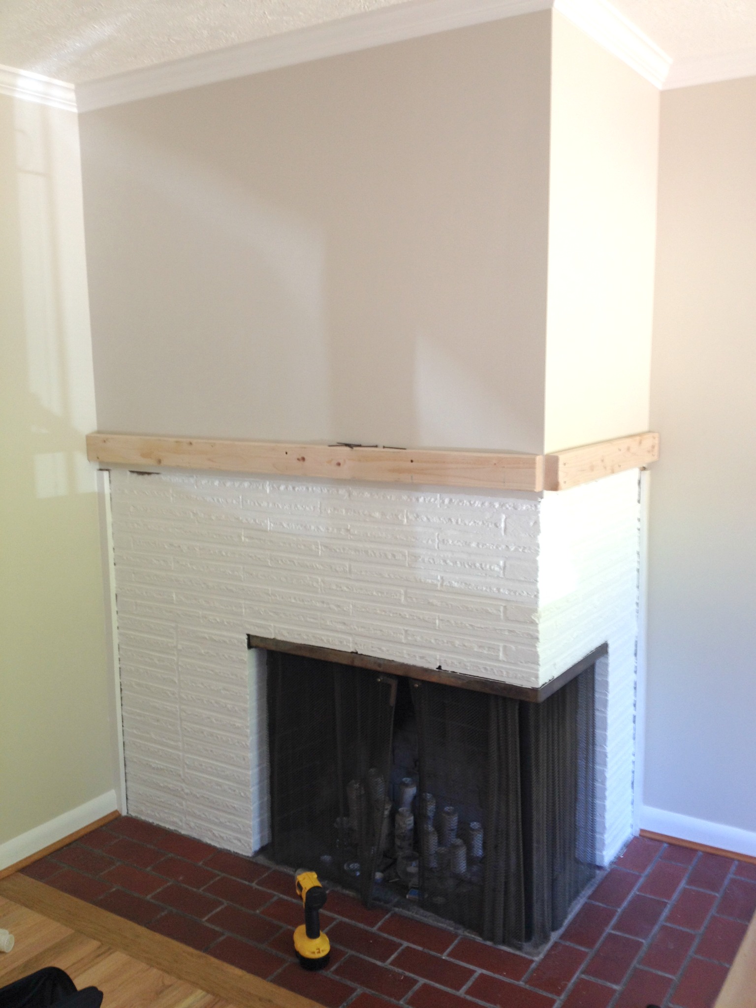I must say, that is a very nice looking fireplace. I really like what you did with the mantle along with painting the brick white. It looks very clean and modern. Great job.